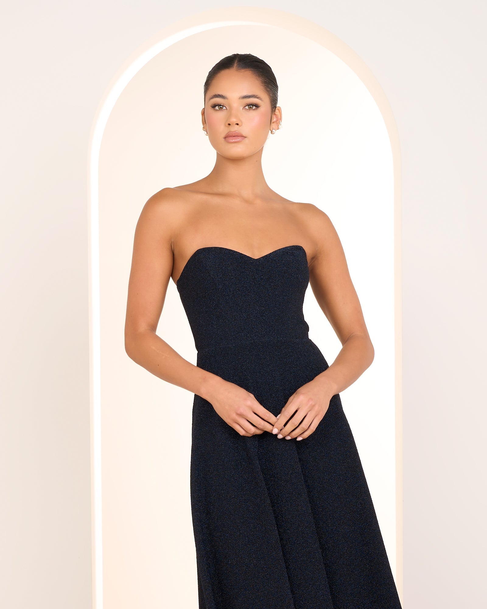 - Metallic fabrication in a navy hue; medium stretch