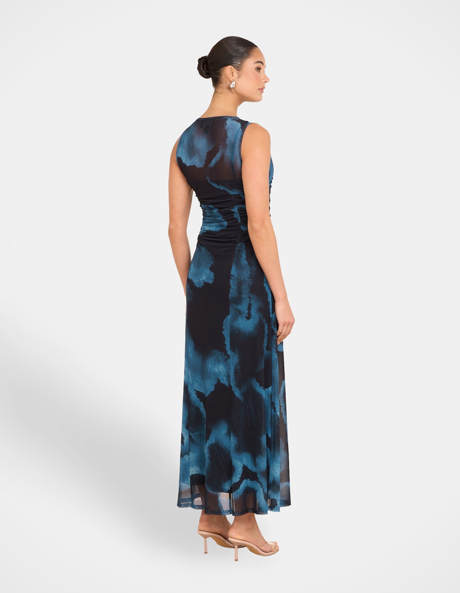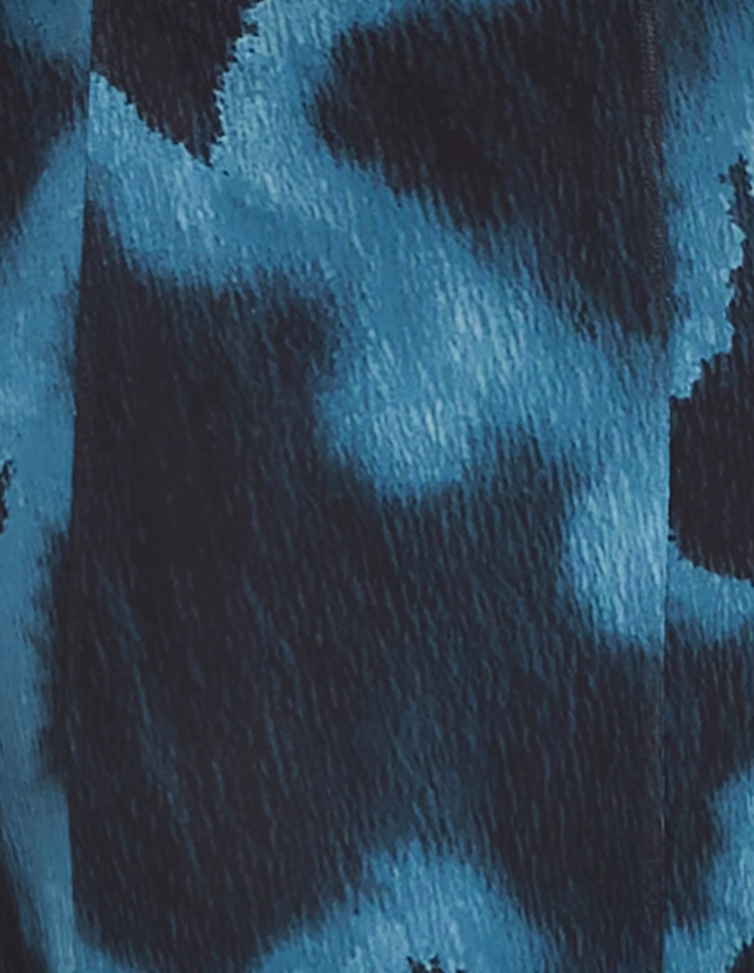 - Printed mesh fabrication with stretch; blue abstract print on a black base