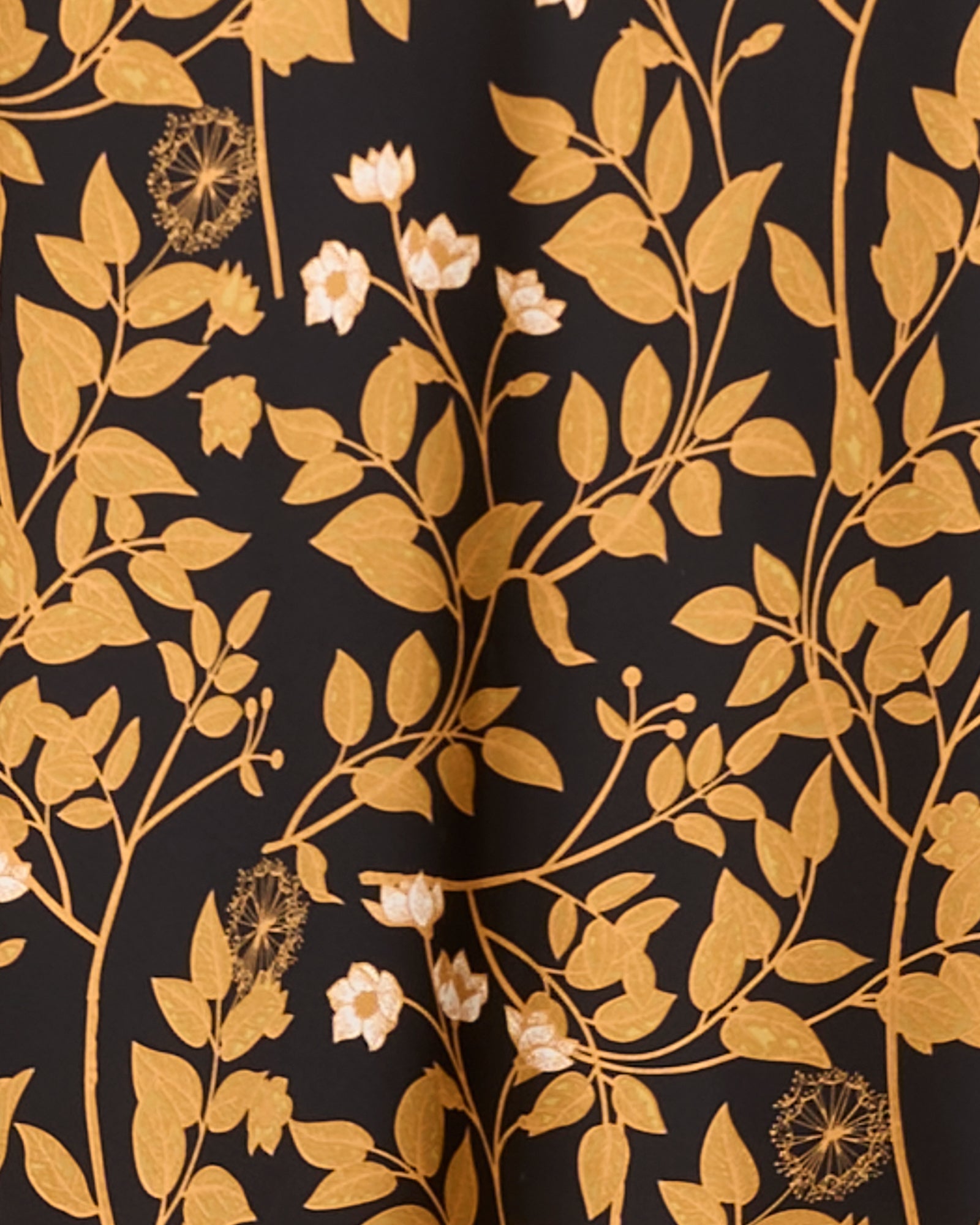 - Satin print fabrication; bronze leaf print on a black base; non stretch