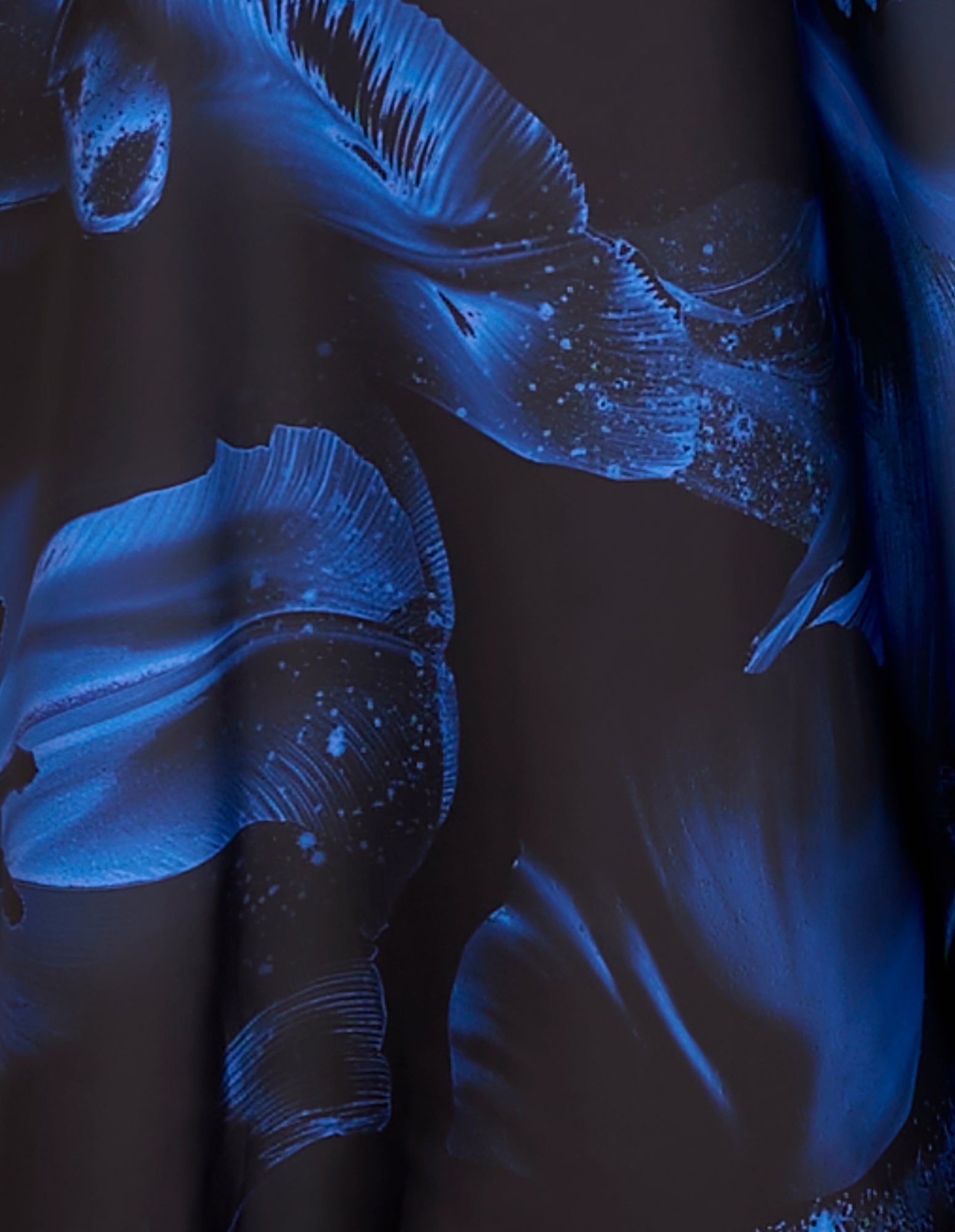 - Luxurious fabrication with slight stretch; abstract blue floral print on a black base