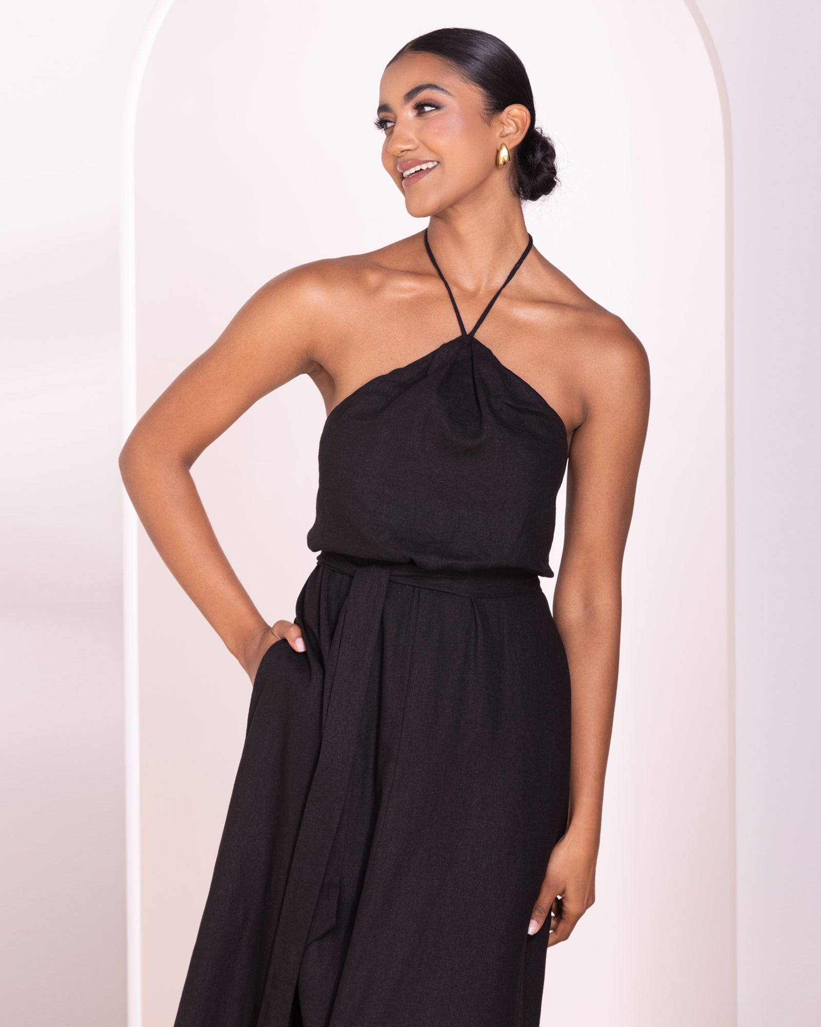 - Halter pointed neckline with self-tie closure