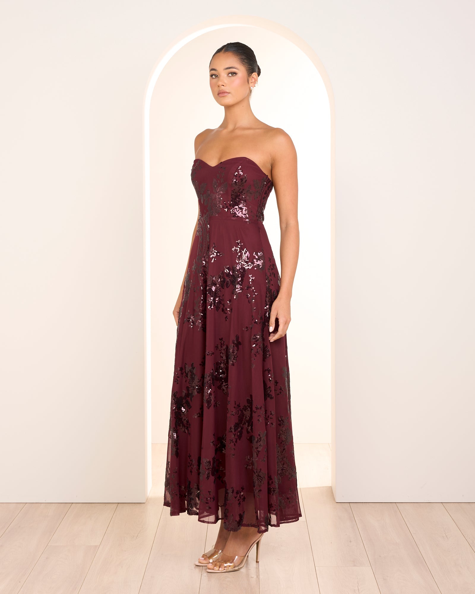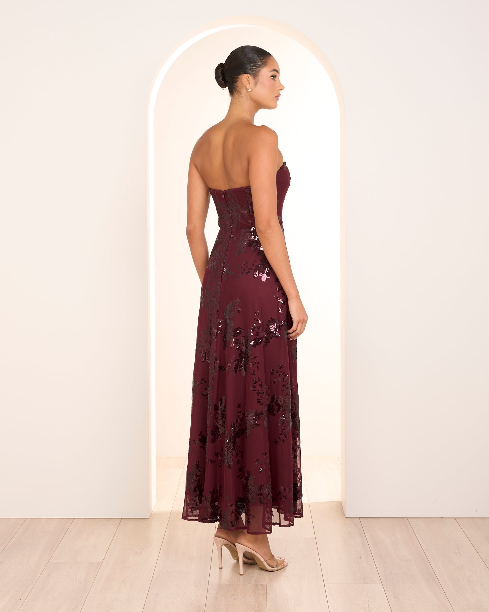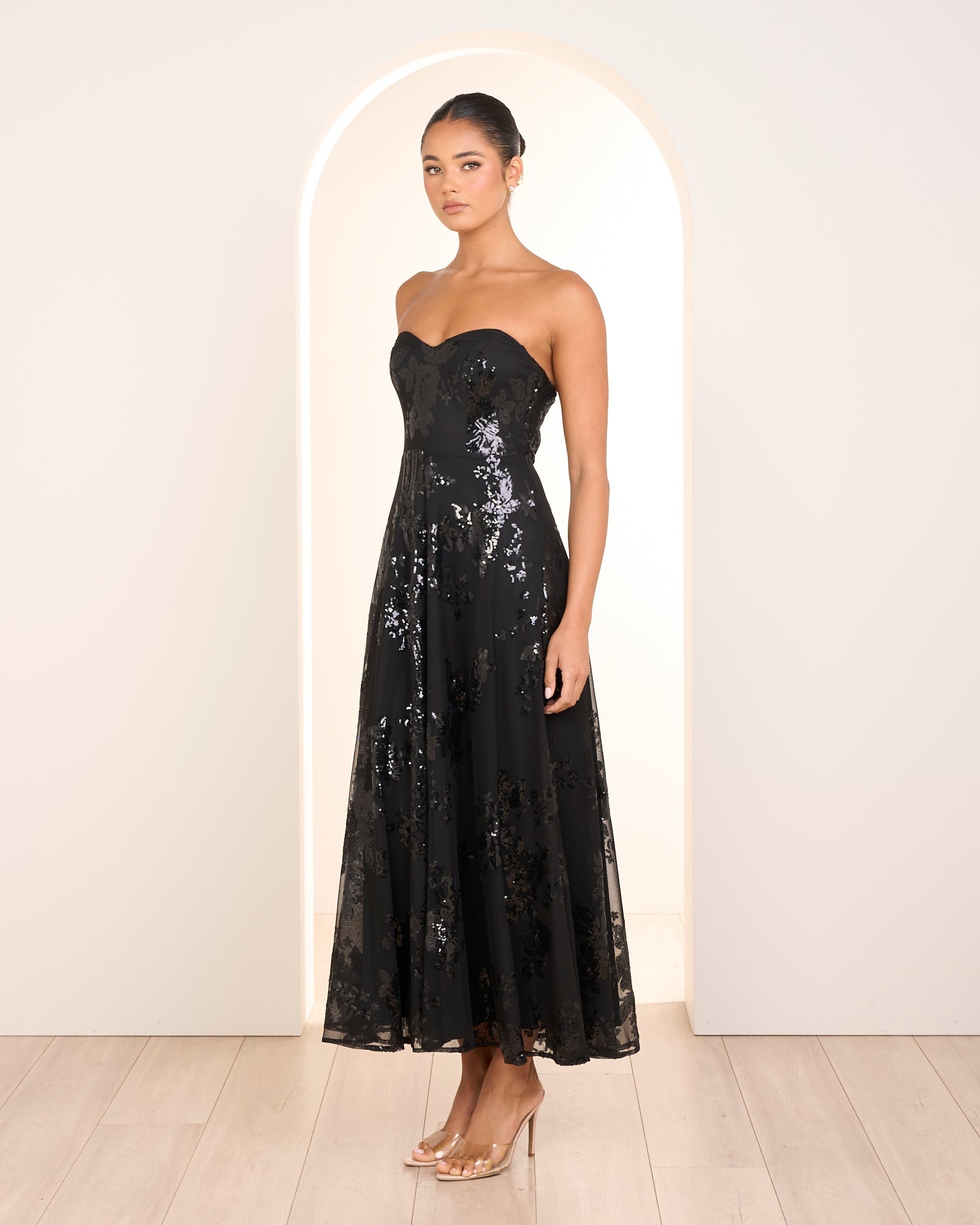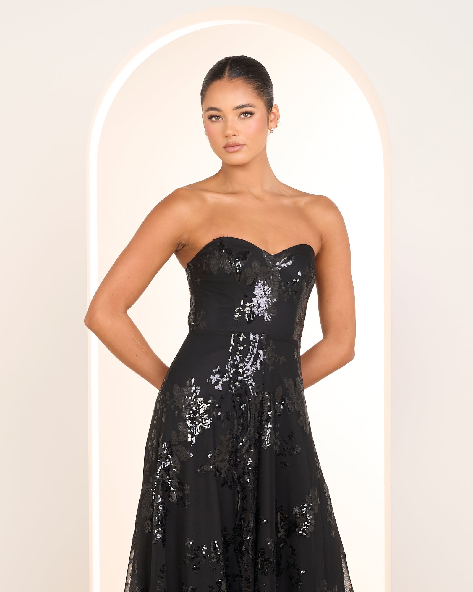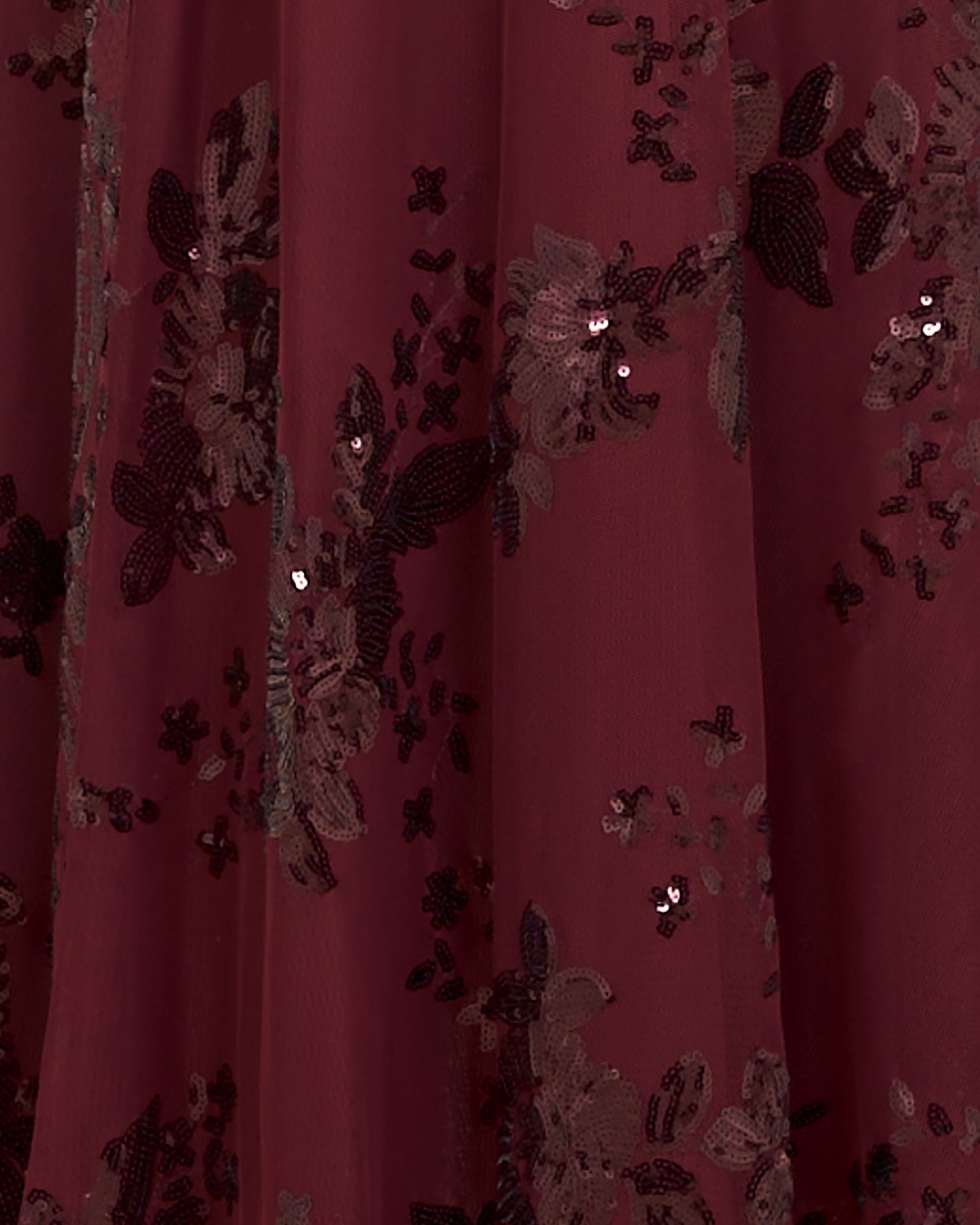 - Mesh overlay fabrication with floral sequin detail; high stretch
